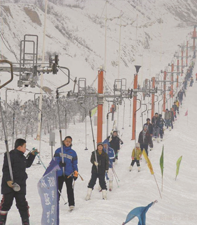 拖牽索道主要用于滑雪場的滑雪道,拖牽索道工作原理:按一定間距將拖牽器通過抱索器聯于鋼絲繩上,驅動輪帶動鋼絲繩運轉,乘客穿上滑雪板、雪橇或其它冬季運動裝備等,由拖牽器拖拽將乘客運轉至目標位置,實現拖載乘客的目的。